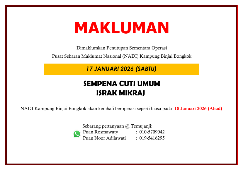 Pendaftaran Intake 3 Program Mahir dibuka bermula 22 Disember 2025 (Isnin) Pendaftaran awal melalui MTS. Mohon petugas NADI untuk enroll course dan sesi kelas peserta. Peserta yang berminat, sila kunjungi NADI berdekatan Jom rebut peluang tingkatkan kemahiran & jana potensi […]